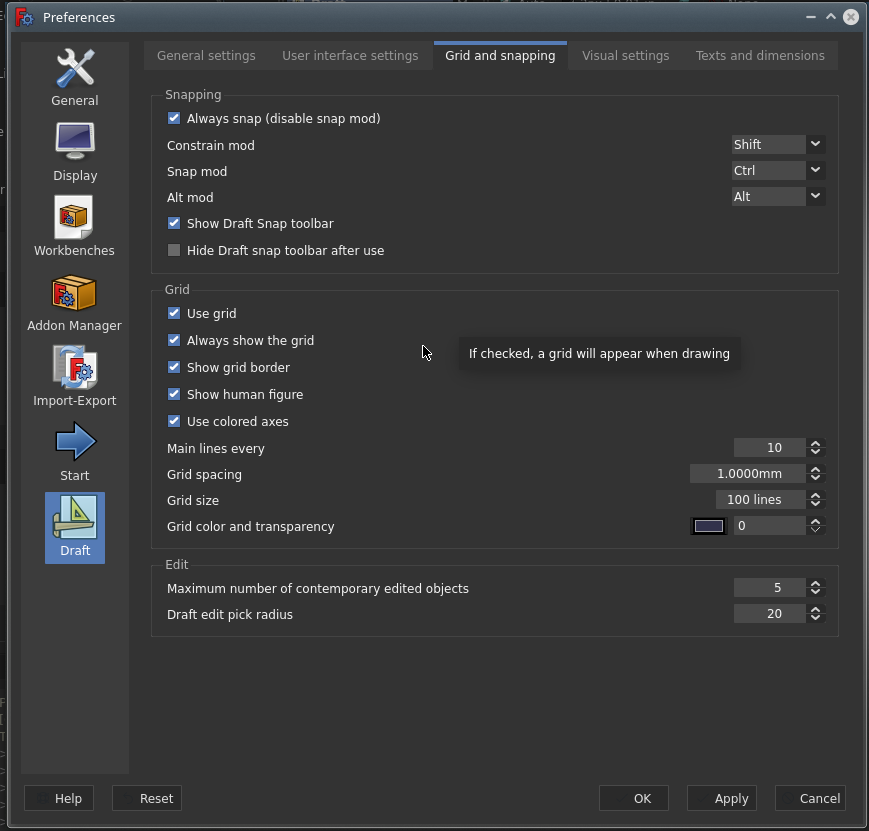 | Description | In preferences general select an imperial units. Go to draft workbench then bring preferences up. Select draft->snap settings. Grid spacing is always mm | ||||