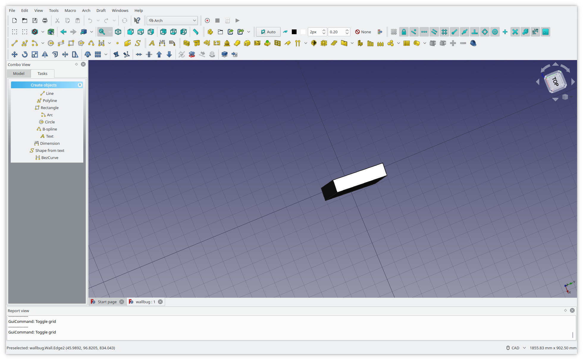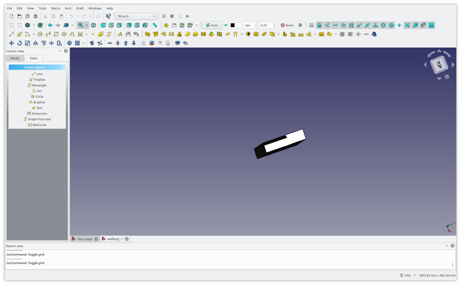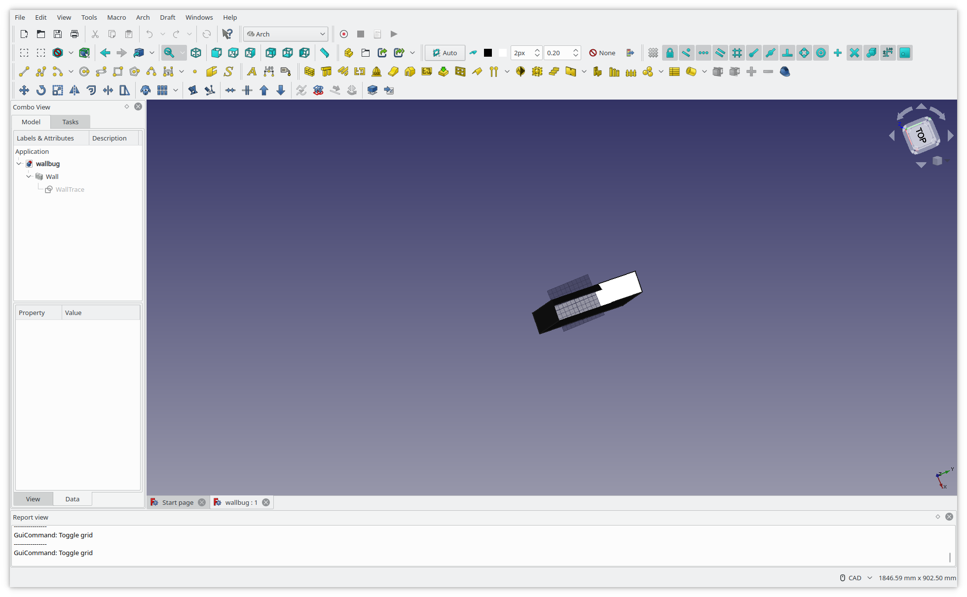 | Steps To Reproduce | - Use FreeCAD version from git shown in the section FreeCAD information. - Ensure the grid settings are "factory default". - Select Arch workbench. - Load the attached wallbug.FCStd file. - Make the grid visible (for me the grid is not always visible at first even though I believe it is "on" - I have to turn if off first and then back on). - Try changing the grid spacing and turning the grid off. | ||||
