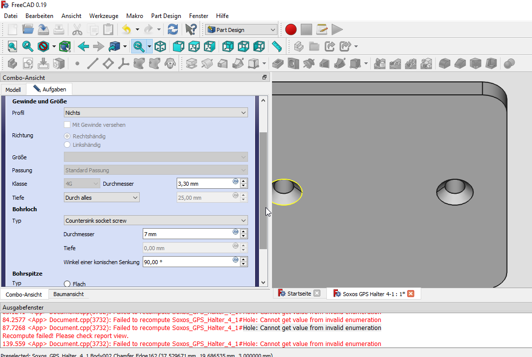 | Description | Changing a hole from profile Iso to Nothing runs into the error message: "Hole: Cannot get value from invalid enumeration". It is not possible to confirm the ch 204.555 <App> Document.cpp(3732): Failed to recompute Soxos_GPS_Halter_4_1#Hole: Cannot get value from invalid enumeration Thread size out of range Unhandled Base::Exception caught in GUIApplication::notify. The error message is: Thread size out of range <Exception> Thread size out of range | ||||