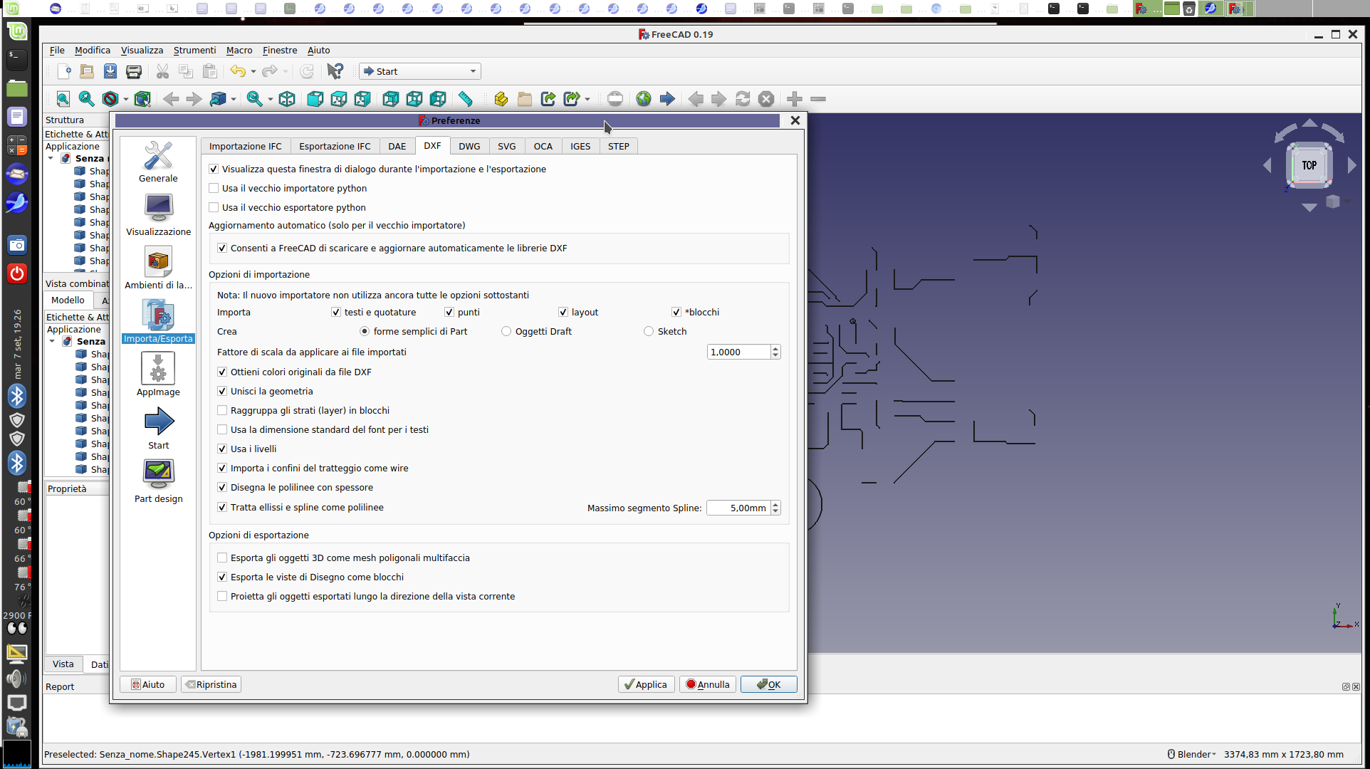 see how is rendered by FreeCAD last stable on Linux: OS: LMDE 4 (debbie) Word size of OS: 64-bit Word size of FreeCAD: 64-bit Version: 0.18. Build type: Release Python version: 2.7.16rc1 Qt version: 5.11.3 Coin version: 4.0.0a OCC version: 7.3.0 Locale: Italian/Italy (it_IT) same as 0.19 on Windows |