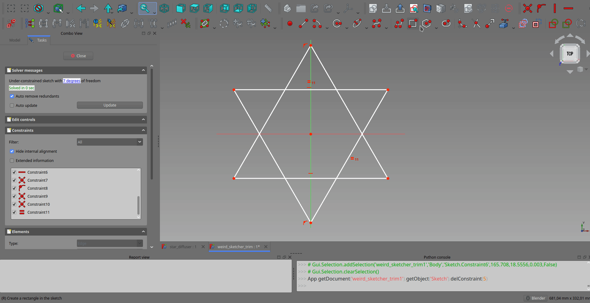 | Steps To Reproduce | 1.) Open attached freecad file. 2.) Trim the edge as in the attached gif 3.) Observe how Constraint11 is transferred to the left of the two new edges after trimming. Desired behavior is that the star shape is maintained. I.e Constraint11 should be removed as part of the trim operation. | ||||